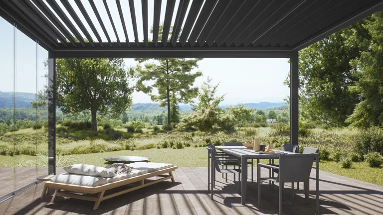 - Toiture à lames orientables : Le toit est constitué de lames en aluminium (généralement motorisées) qui peuvent pivoter.